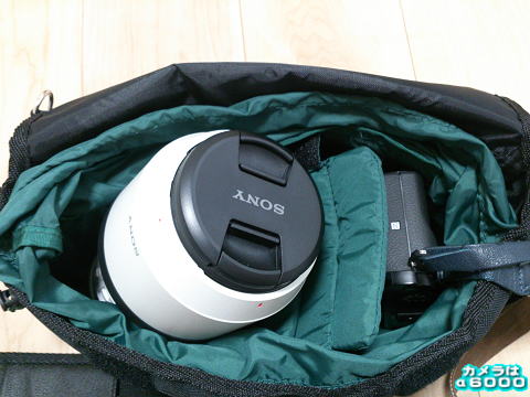 でもこの望遠を立てて、仕切りを付けてSEL55F18Zを装着したα6000を入れましたところ、入りますね。レンズフードも付いてますが。