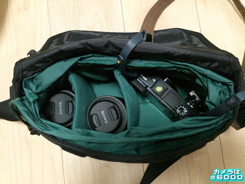 こちらは仕切りを1枚使って、単焦点レンズ装着のα6000とマクロレンズ1本を収納した状態。