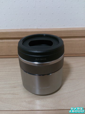 α6000に装着しました。シルバーもたまにはいいですね。接写しやすく、レンズをキズや汚れから守る楕円っぽいレンズキャップが付属します。